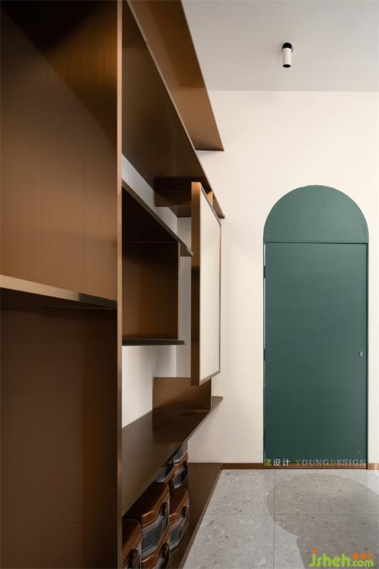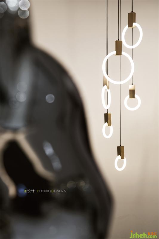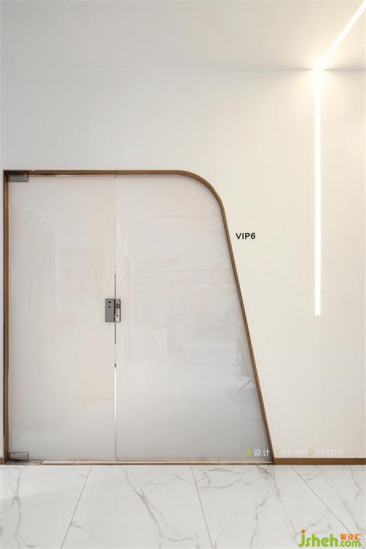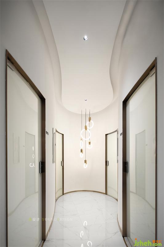 光滑透亮的大理石紋磚、晶瑩通透的玻璃門、高級(jí)精致的金屬元素,過道空間在環(huán)形吊燈的映照下,洋溢著干凈靈動(dòng)的氣息。