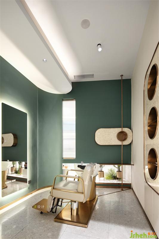 不同VIP室結(jié)合室內(nèi)空間的尺寸與朝向,用最簡(jiǎn)潔的店鋪裝修設(shè)計(jì)手法進(jìn)行創(chuàng)作,以復(fù)古綠+金屬為主要元素,穿插運(yùn)用鏡面和石材,憑借材料本身的造型與質(zhì)感,描繪出豐富的動(dòng)態(tài)空間效果。