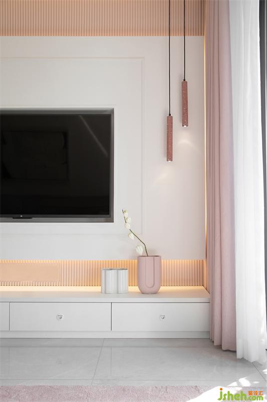 客廳電視墻采用幾何線條與塊面穿插的設(shè)計(jì)手法,以臟粉色格柵做銜接,結(jié)合白色相框型護(hù)墻板和白色電視柜,形成連而不斷的視覺(jué)感。電視墻上下留空減輕視覺(jué)壓抑感,電線設(shè)備等隱藏在電視機(jī)后方,打開內(nèi)嵌燈帶,點(diǎn)亮一室溫柔。