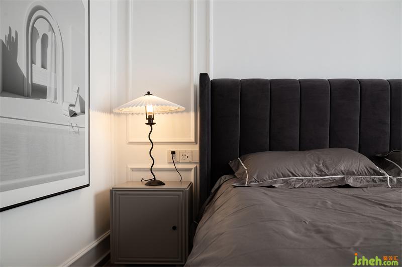 主臥延續(xù)整體簡(jiǎn)約但有細(xì)節(jié)的基調(diào),以乳白色石膏線條為背景造型,搭配深咖色高背床和高級(jí)灰色床頭柜,支一盞藝術(shù)傘狀臺(tái)燈,加一幅黑白灰抽象掛畫(huà),于色調(diào)深淺之間,藝術(shù)儒雅的氛圍感悄然流露。