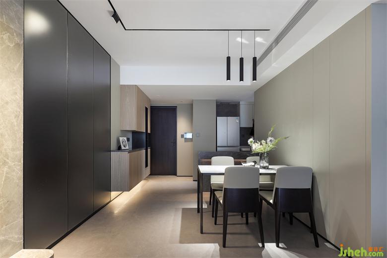 與鞋柜相對(duì)的是廚房和餐廳,因業(yè)主不常做飯,所以將廚房改為開放式和餐廳連接為一體,另一端則一直延伸至生活陽臺(tái),使廚房臺(tái)面和活動(dòng)空間得到擴(kuò)大。