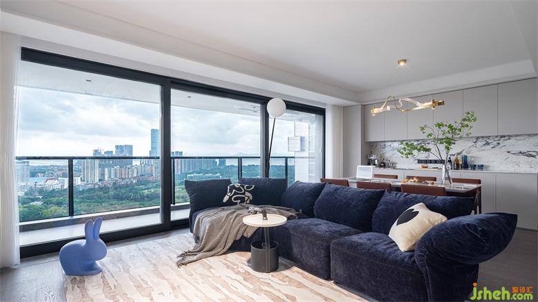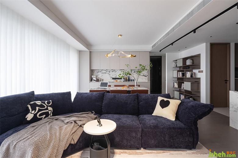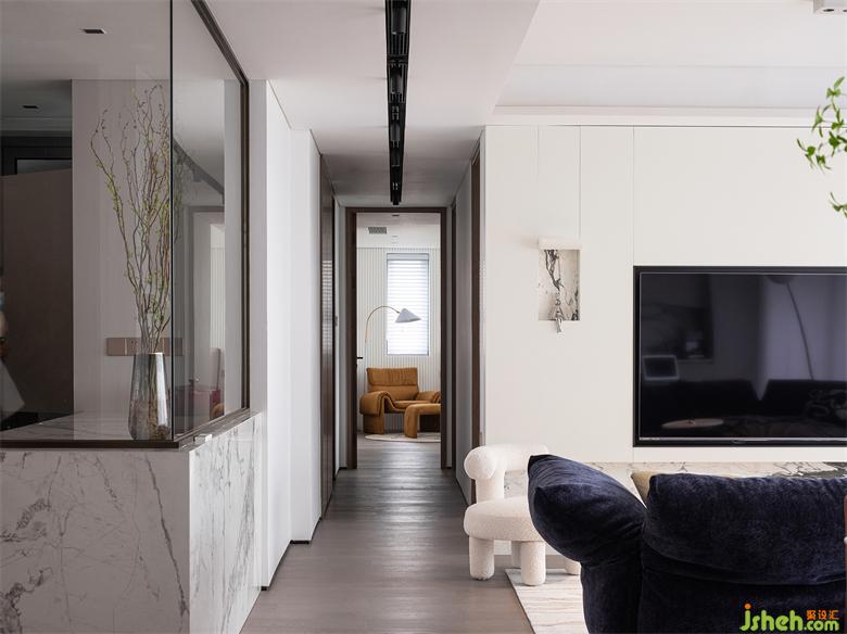 客廳與玄關(guān)、廚房中間的過道較為寬裕,空間動線舒適便捷。家裝設(shè)計師上方的軌道射燈干凈利落,美觀之余補(bǔ)充室內(nèi)光線??蛷d、陽臺以落地玻璃推拉門相隔,光線可以無遮擋地進(jìn)入室內(nèi),整個客廳通透加倍,讓居家空間有著更加愜意的放松感。