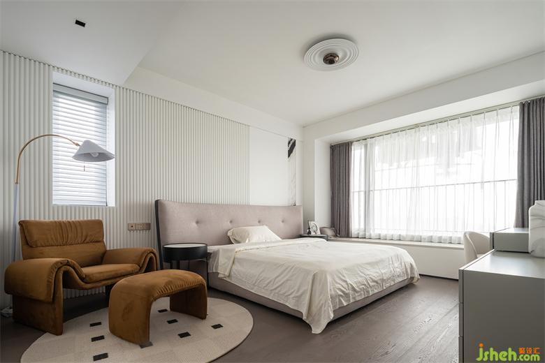 臥室設(shè)計(jì)延續(xù)整體簡(jiǎn)約大方的風(fēng)格,以白色木格柵+護(hù)墻板徐徐鋪開(kāi),連續(xù)又有間隙的自然縫造型讓幾何之美充分凸顯,也讓原本平面的墻面富有層次,仿佛白色海浪的漣漪,蕩漾著柔美的夢(mèng)境。家裝設(shè)計(jì)師亮眼有質(zhì)感的棕黃沙發(fā)和腳凳,做工考究的柔軟地毯,低調(diào)灰的夢(mèng)幻窗簾,無(wú)一不彰顯著生活情趣與藝術(shù)情調(diào)。