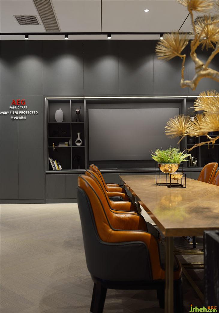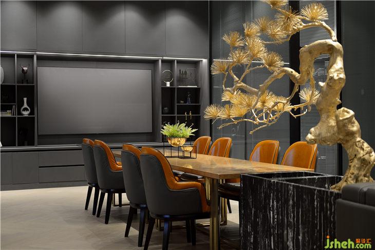 空間內(nèi)灰金的人字拼地板,與深色墻板的對比,深淺間呈現(xiàn)高級感;以木為媒介,巖板洽談桌上的金色陳設(shè),在明亮的燈光的照射下,互相映襯,展現(xiàn)出質(zhì)感的魅力;椅子以引人注目的橙色為主調(diào),溫暖而明亮凸顯出以客主為的中心感。
