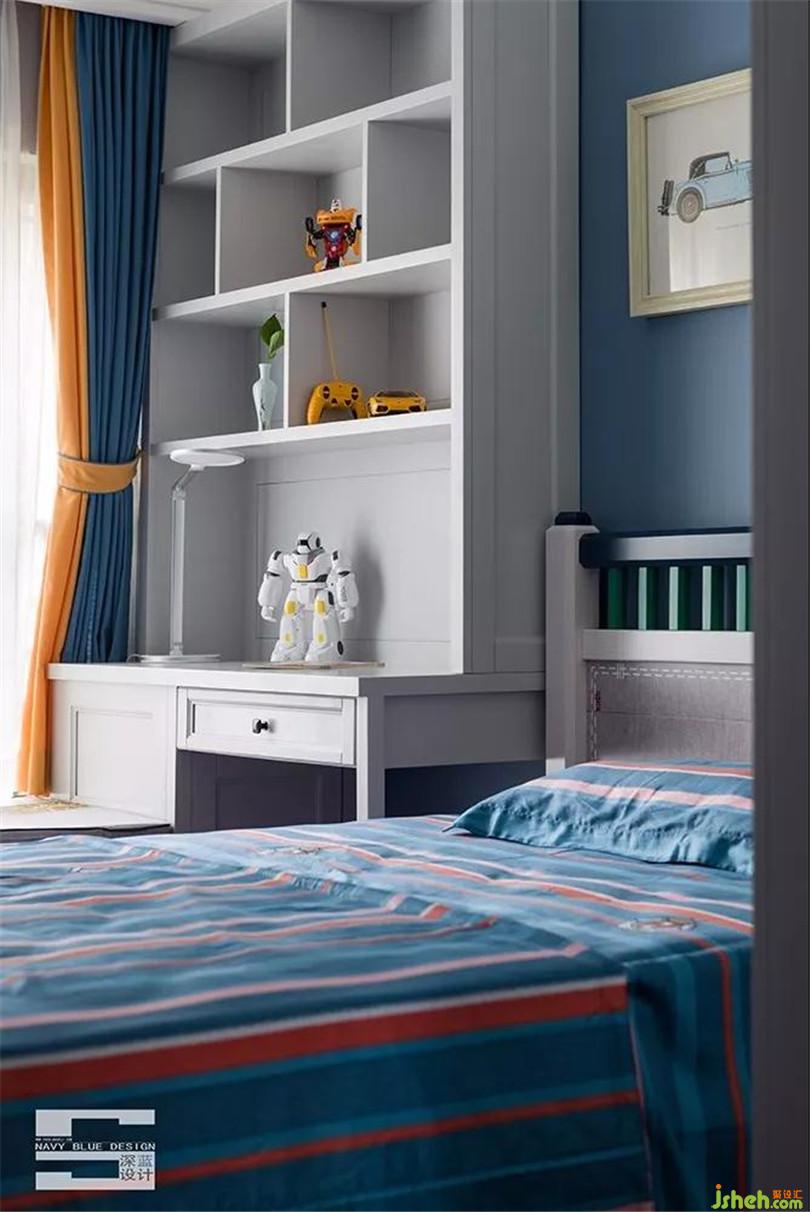 兒童房的光線非常充足,純凈的藍(lán)色墻紙搭配白色書桌,點(diǎn)綴多元素的童趣玩具,即寧靜又活潑。讓美麗的光線和生動(dòng)的色彩陪伴孩子成長。