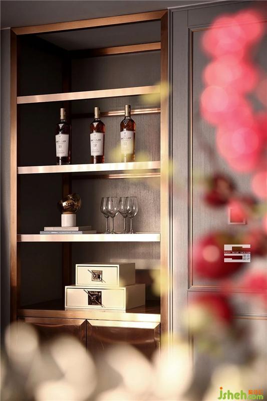 圓在中國(guó)有著一家人團(tuán)團(tuán)圓圓的寓意,在儀式感很重的餐廳中配以白色大理石圓形餐桌,不僅提升空間的亮度,更有助于家人之間情感的升溫;吊頂之下淡雅大理石的圓桌搭配深木飾面座椅,椅腿與阿瑪尼的藍(lán)色絲絨坐墊,無一不從細(xì)節(jié)上展現(xiàn)設(shè)計(jì)師的巧妙心思;金屬邊框紅色藝術(shù)掛畫打破靜謐的氛圍,使餐廳多了一份熱鬧、活潑,仿佛聽到一家人圍坐在餐桌邊吃飯時(shí)歡聲笑語(yǔ)。