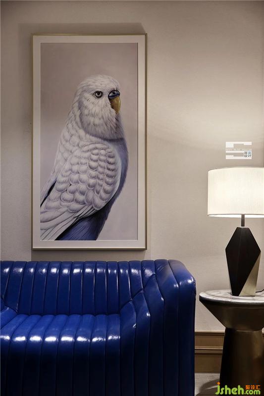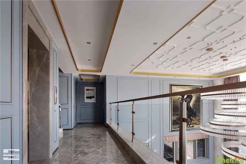 二層走廊大面積透明玻璃自樓梯口處延伸環(huán)抱,平靜且節(jié)制的展示方式增強(qiáng)了一樓與二樓之間的互動(dòng)性,古堡灰地磚與跳躍黑馬圖案的金屬邊框掛畫相得益彰。我們通過材料連貫與區(qū)分,勾勒空間的韻律,營(yíng)造出一番別致韻味,整體線條簡(jiǎn)約流暢,干凈利落。