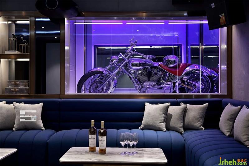 定制版的哈雷摩托車在整個(gè)空間中起到畫龍點(diǎn)睛的作用,在與業(yè)主溝通中,設(shè)計(jì)師了解到業(yè)主對(duì)哈雷摩托車的需求:既要展示,又要方便騎行。而影音室后面是車庫,設(shè)計(jì)師利用車庫剛好比影音室的地面高出1.1米的落差優(yōu)勢(shì),定制了一個(gè)哈雷摩托車停車庫與影音室通透的展示柜,滿足了展示與實(shí)用的功能。