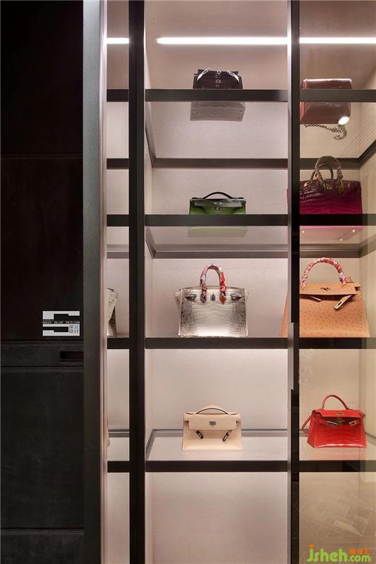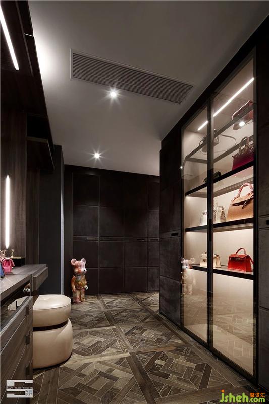明亮的主臥與沉穩(wěn)暗黑的衣帽間形成鮮明對比。黑色布紋硬包的大衣柜充滿整個(gè)墻壁,大號BR@RBRICK積木熊屹立在轉(zhuǎn)角處,大型展示柜陳列著女主人的心頭大好----款式不一的Hermes包包,濃郁的輕奢感溢滿而出。走進(jìn)衣帽間,對鏡貼花黃,你就是這里的女王。