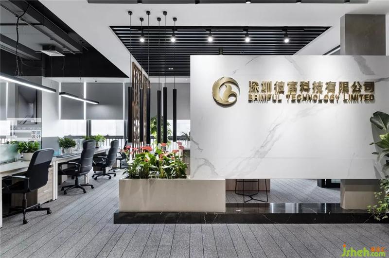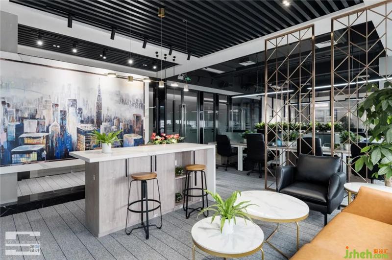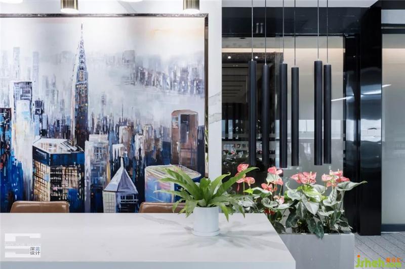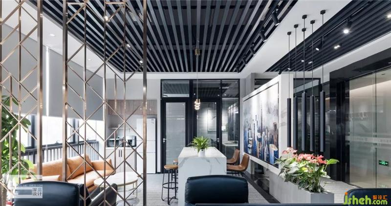 高低錯落的形象墻有別于傳統(tǒng)的形象墻,既增加空間的亮度,又使沉穩(wěn)干練的空間多了份趣味;形象墻、綠植與北歐黑色吊燈,將休閑區(qū)與入門處分隔,起到一個隔斷的作用。