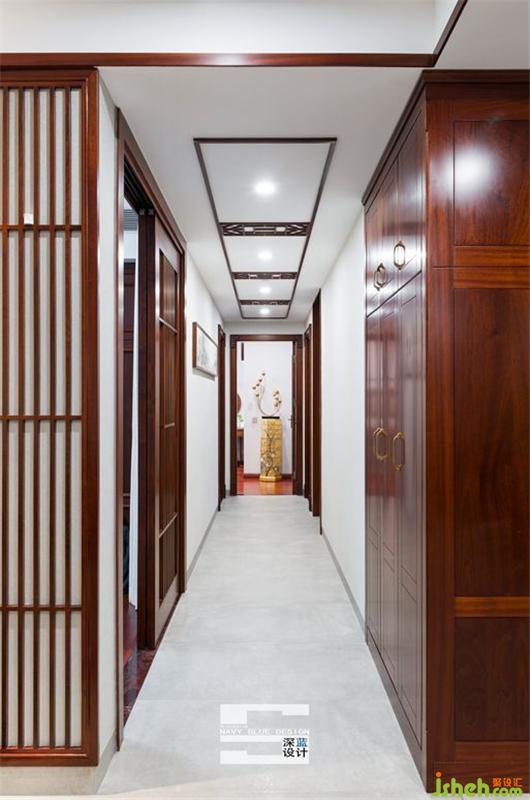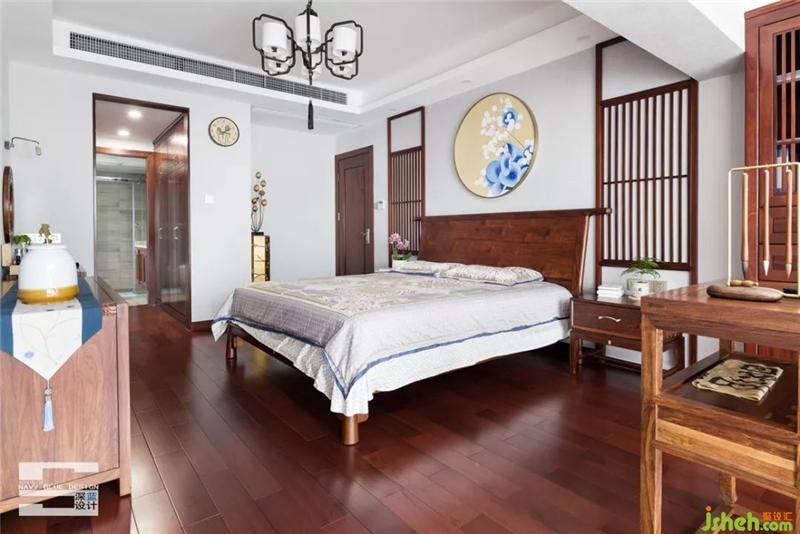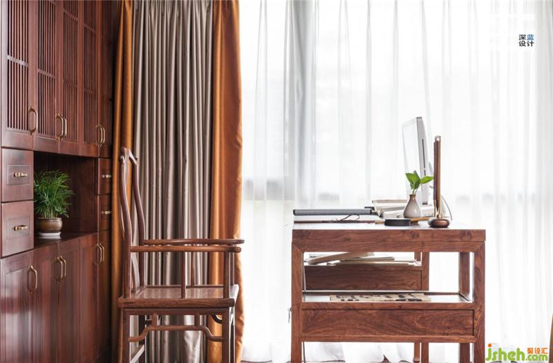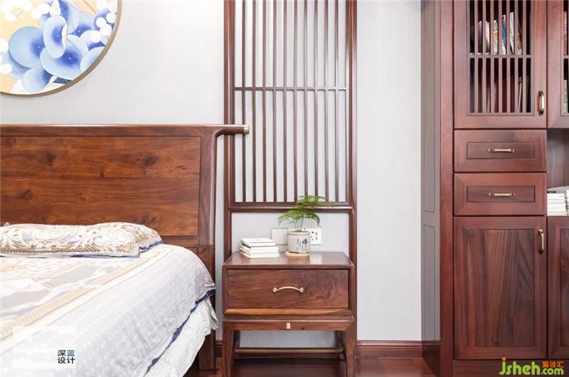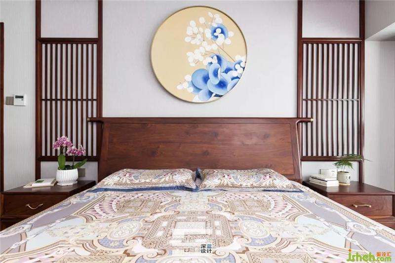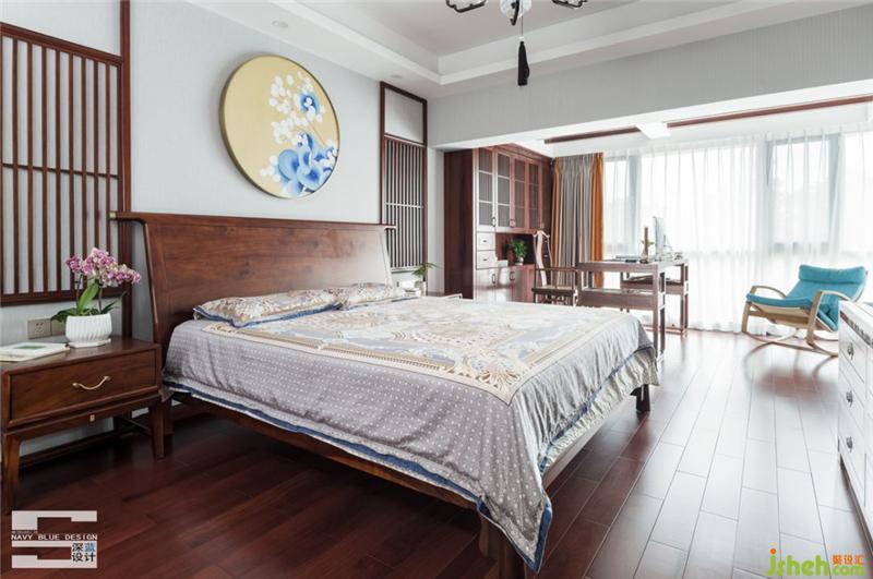 主臥延續(xù)整個(gè)空間的設(shè)計(jì)基調(diào)。深棕木色的家具,搭配格柵元素背景墻、書柜門,沉穩(wěn)卻不失活力;靠近窗簾一側(cè)的單人摩登藍(lán)色沙發(fā)、杏黃色窗簾混搭,不僅不顯突兀,反而表現(xiàn)出主人的美感與生活態(tài)度;入門處的六角柜、圓形素雅掛畫、線條鮮明的黑白吊燈、床頭的綠植盆栽,剛?cè)嵯酀?jì),簡(jiǎn)明而饒富古典的意蘊(yùn)淋漓展現(xiàn)。