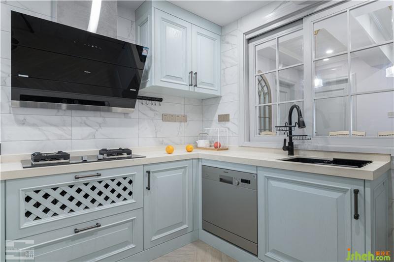 廚房是采光弱區(qū),薄荷藍的櫥柜和白色大理石紋的墻壁使廚房變得明亮,自然光線透過玻璃窗照射進來,廚房變得通透。