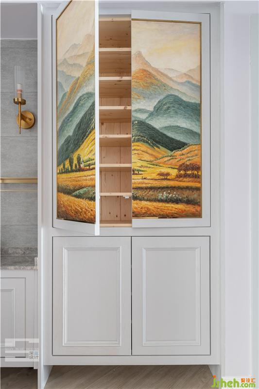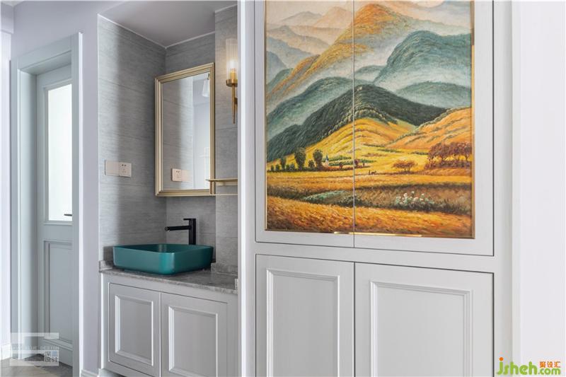 設(shè)計(jì)師了用過道的優(yōu)勢(shì),將衛(wèi)生間洗手臺(tái)外置,緩解衛(wèi)生間的空間緊張感,又增加便利性;門廳的鞋柜上的鄉(xiāng)村風(fēng)景畫,豐富飽滿的自然色彩,透露出一股溫暖的氣息,讓人浮現(xiàn)《最后、起始,現(xiàn)在》里的“最后的一朵月季格外猩紅,最后的一片野菊格外嬌黃,最后的一片荷田、金的梗上垂著枯葉”,詩(shī)意滿滿。