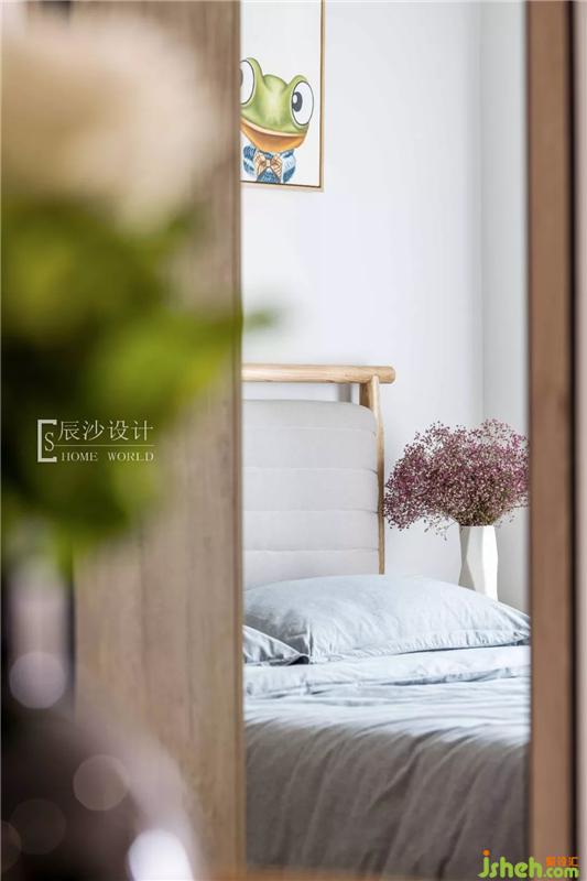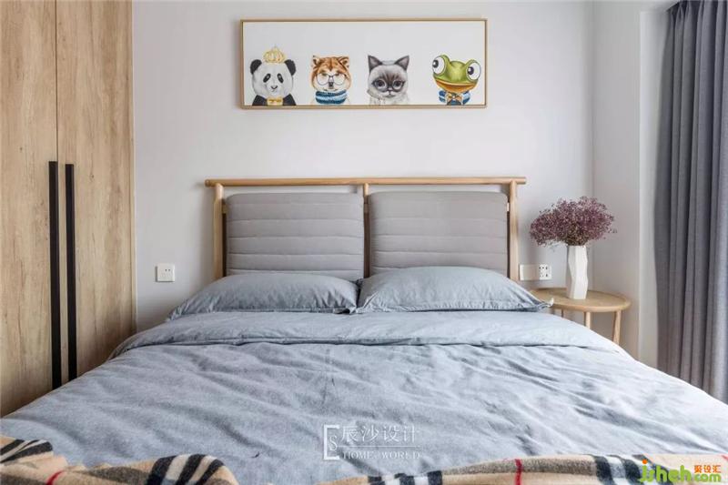 次臥就像一個(gè)小森林般自然、清新,原木床搭配淡藍(lán)色的床單,一旁的粉色干花,一呼一吸都是那么的柔和。墻上的卡通掛畫(huà)就像森林里的動(dòng)物,空間變得充滿活力。室內(nèi)設(shè)計(jì)師