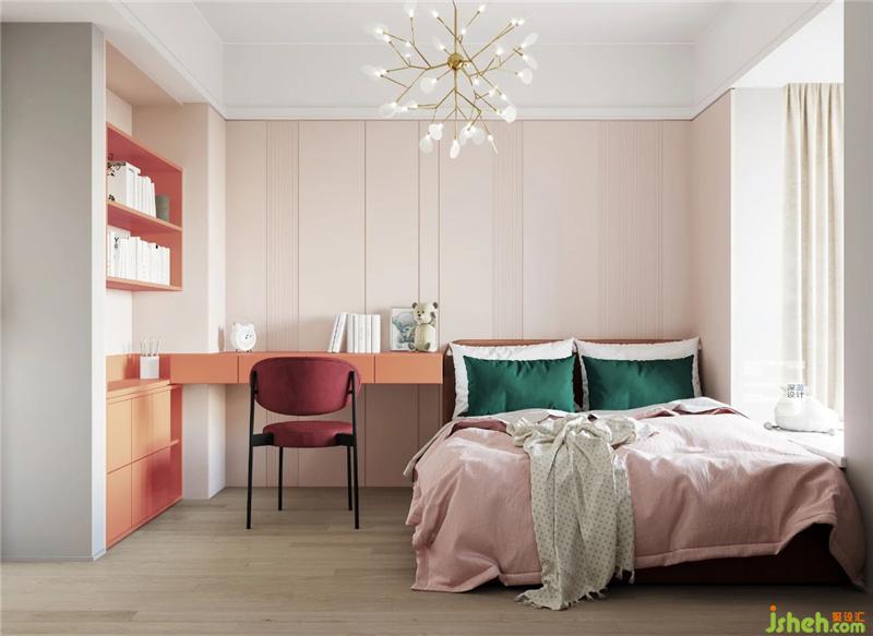 以粉色為底色的次臥,給人一種優(yōu)雅柔和的感覺;利用戶型的優(yōu)勢,靠墻設(shè)計儲物柜式書柜,以書桌形式延伸到床頭處,節(jié)省空間之余也增加空間的收納。室內(nèi)設(shè)計師