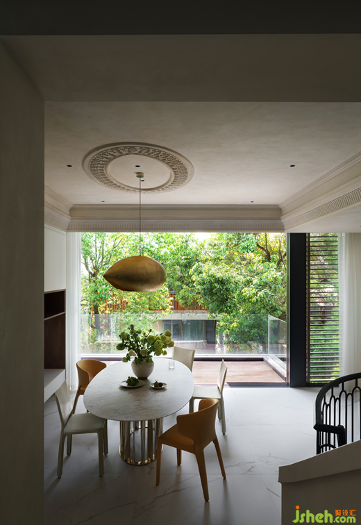 成都別墅設計以橢圓元素為主的主餐區(qū)既圍坐親和,又不像正圓餐桌那樣的正式。樓梯處的綠色墻體有著大自然皮膚一樣的肌理,與橢圓鏡子里映射出的自然、戶外真實的綠意形成呼應。