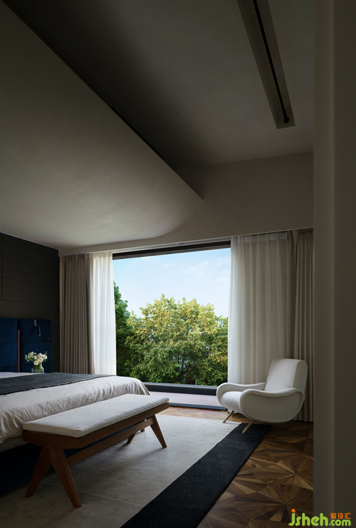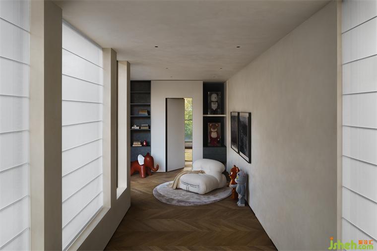 三層生活空間有著比一、二層更多的攝影和藝術品,其中,攝影都是男主人的生活習作與記錄,凝固著自己和家人體驗過的畫面。設計師將此作為裝飾家的藝術:將其散落布置在家的各個角落,畫框里放進了往日存在,休息的時候就像休息在自己的往昔時光里,這樣就能輕易的獲得舊夢重溫的美妙。