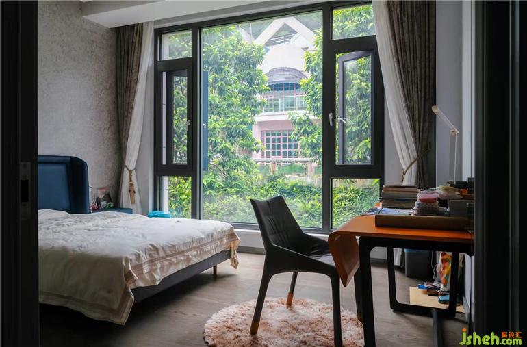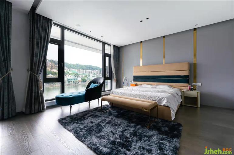 主臥采用厚重的色彩,多種不同的材質,融合于同一個空間內,散發(fā)厚重大氣之韻,加上整體色調的俊雅沉靜,廣州別墅設計共同營造出舒適優(yōu)雅的休憩空間。此時自動窗簾緩慢移動到兩側即可將湖邊美景盡收眼底,帶來心曠神怡視覺享受。