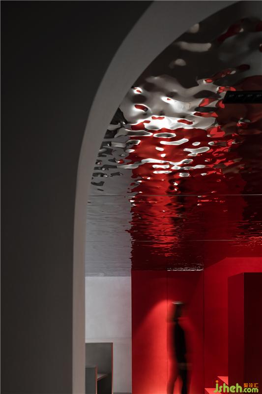 幾何形于弧線的組織,構(gòu)成了空間豐富的表情,于視覺(jué)錯(cuò)像。整體空間用守規(guī)矩的方體進(jìn)行闡述,頂面以及更衣間的弧形門洞打破了空間的平靜,并且給空間帶來(lái)了女性調(diào)皮的性格。夾層只有2.2米的高度,裝修設(shè)計(jì)空間采用波紋鏡面質(zhì)感,解決空間壓抑的條件,模糊了空間的界限。