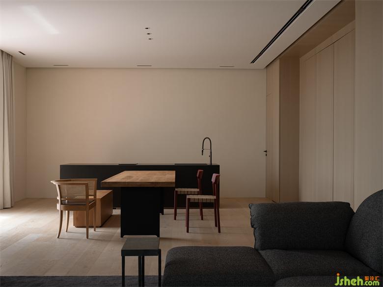 The overall interior design of the residence emphasizes simplicity and comfort. The floor of theliving room and thedining roomare covered withwhite marbles, whichshow simplicity.Walls are clad in large areas ofmilky-white art paint and warm-color wooden veneers, to produce cleanness andthewarm tone of the space. The red glass of the kitchenis ahighlightin thespace,echoing with theredfurniture andredexterior walls, and also giving a sense of comfort and dramatic visual effects. The transparent glass windows on the building facades create harmonious integration between the interiorand thesurrounding outdoorenvironment.In addition, wooden veneers and wooden flooring divide the space into two "boxes"clearly. Theprivacy of the space is enhanced from thepassage.