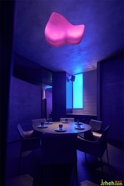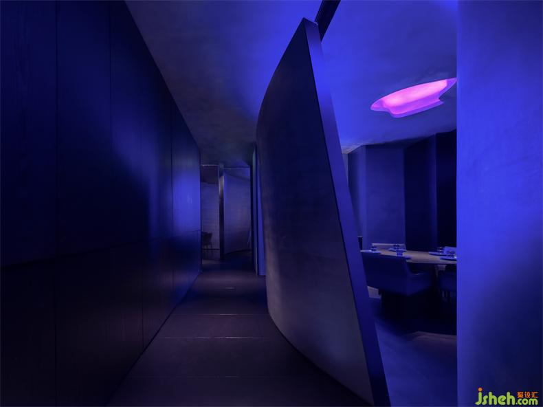 The curved screen walls function as partitions, which demarcate several independent socializing and dining areas. Their dramatic, powerful forms along with the cool lights create a dreamy ambience and convey the brand's avant-garde image as well.