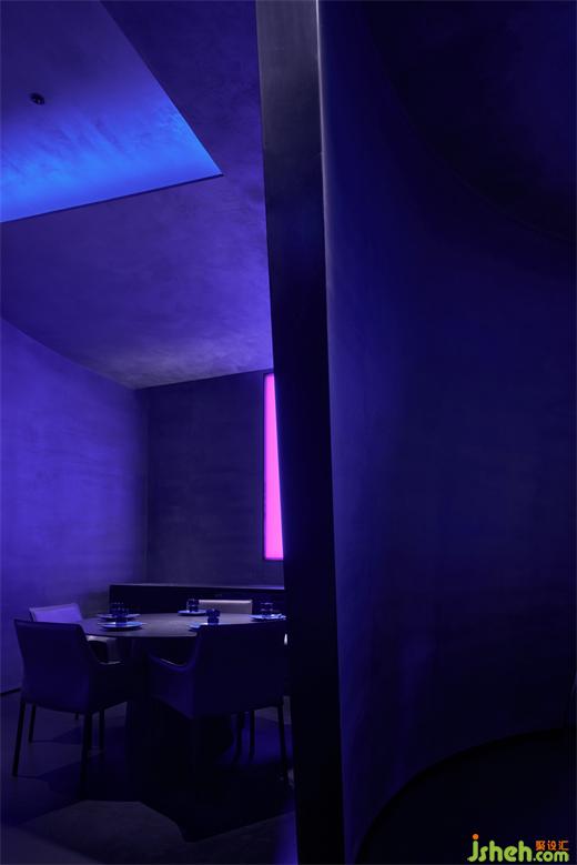 中間散臺區(qū),其內(nèi)在的情緒決定了形態(tài)外延與向上的張力,這種張力是制造場域的聚合的一種力量,藝術餐廳設計與其環(huán)繞更激進的狀態(tài)激發(fā)用餐者流露出放開、社交甚至激昂的情緒意識。吧臺區(qū)域暈染傳達的細微的光影,也揭露出窺探與空間的互動的感受。