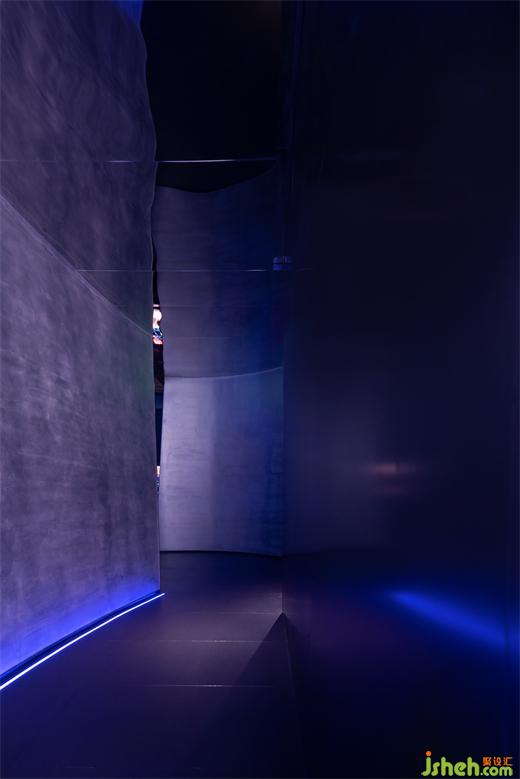 The space subtly incorporates classical jazz and punk blue tones, rather than deliberately emphasizing jazz and punk elements visually. It creates a unique cool, stylish ambience through the composition and the rhythm of light colors. The walls and light circles intersect with each other.