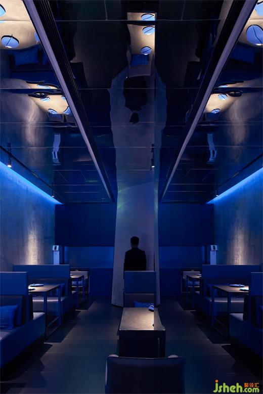 迷幻波長的冷調(diào)藍(lán)光隱現(xiàn)在充滿險(xiǎn)象的體塊情境中,藝術(shù)餐廳設(shè)計(jì)微妙的光影讓空間帶來喘息和微醺曖昧的情愫,對比反差的玫紅色霓虹燈光與餐吧空間高度的鏡像,形成強(qiáng)烈的色彩與光影對比,其魅惑的力量,為觀者創(chuàng)造了一個(gè)迷幻體驗(yàn)情境;最終形態(tài)是一種自由的、魔幻的,激進(jìn)的藝術(shù)氛圍。