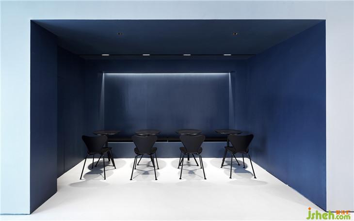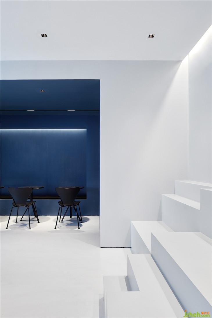 嵌入的藍色空間圍合著靜隅獨處的儀式感,入口區(qū)的大長桌則考慮到多人用餐的互動性。階梯區(qū)的趣味設計既是過渡的灰空間,又為有限的場地容納進更多的功能。一系列的空間操作絲毫不亂,是設計師投入理性分析和藝術感知后得出的最佳解決方案。