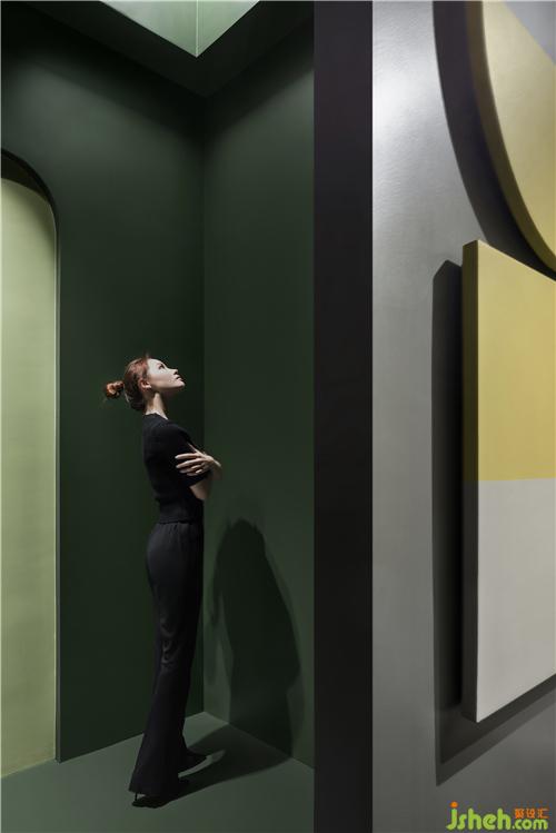 圓與方的圖形界面之外,增加了拱形的元素,充當(dāng)動線中的視覺導(dǎo)覽,讓觀展的體驗(yàn)猶如穿梭于林間小屋。圍而不合的空間序列中,人與人之間的聯(lián)系不斷滲透,互為彼此的框景,也在光影藝術(shù)夢境中尋獲本真的自我。展廳設(shè)計