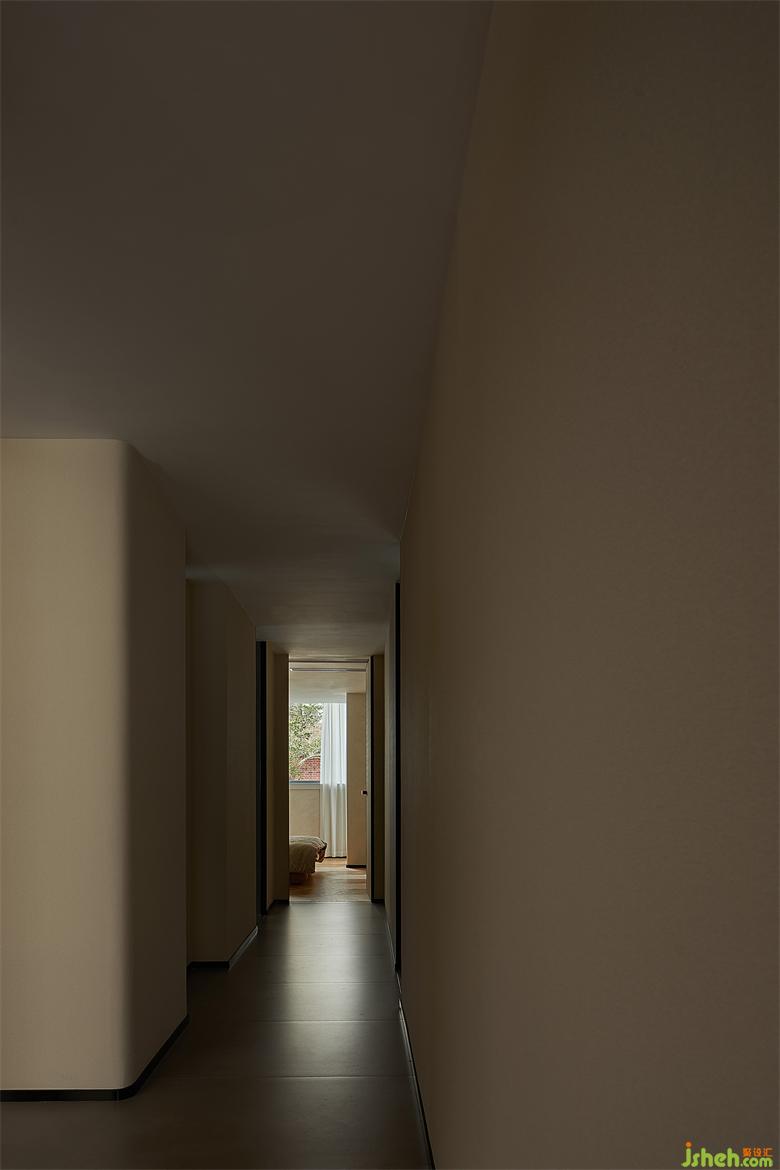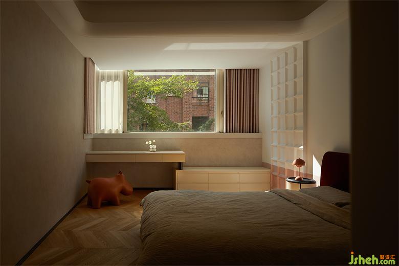 在簡潔的空間內(nèi),設(shè)計(jì)師預(yù)留大面積的窗景,使屋外的自然景觀成為室內(nèi)不可或缺的一部分,微風(fēng)拂拂,斑駁的樹影隨著日出日落在室內(nèi)形成不同的畫作,花園疊墅設(shè)計(jì)模糊了建筑、空間、自然、與生活的界限。坐在書桌前,仿佛伸手就能觸碰綠葉。