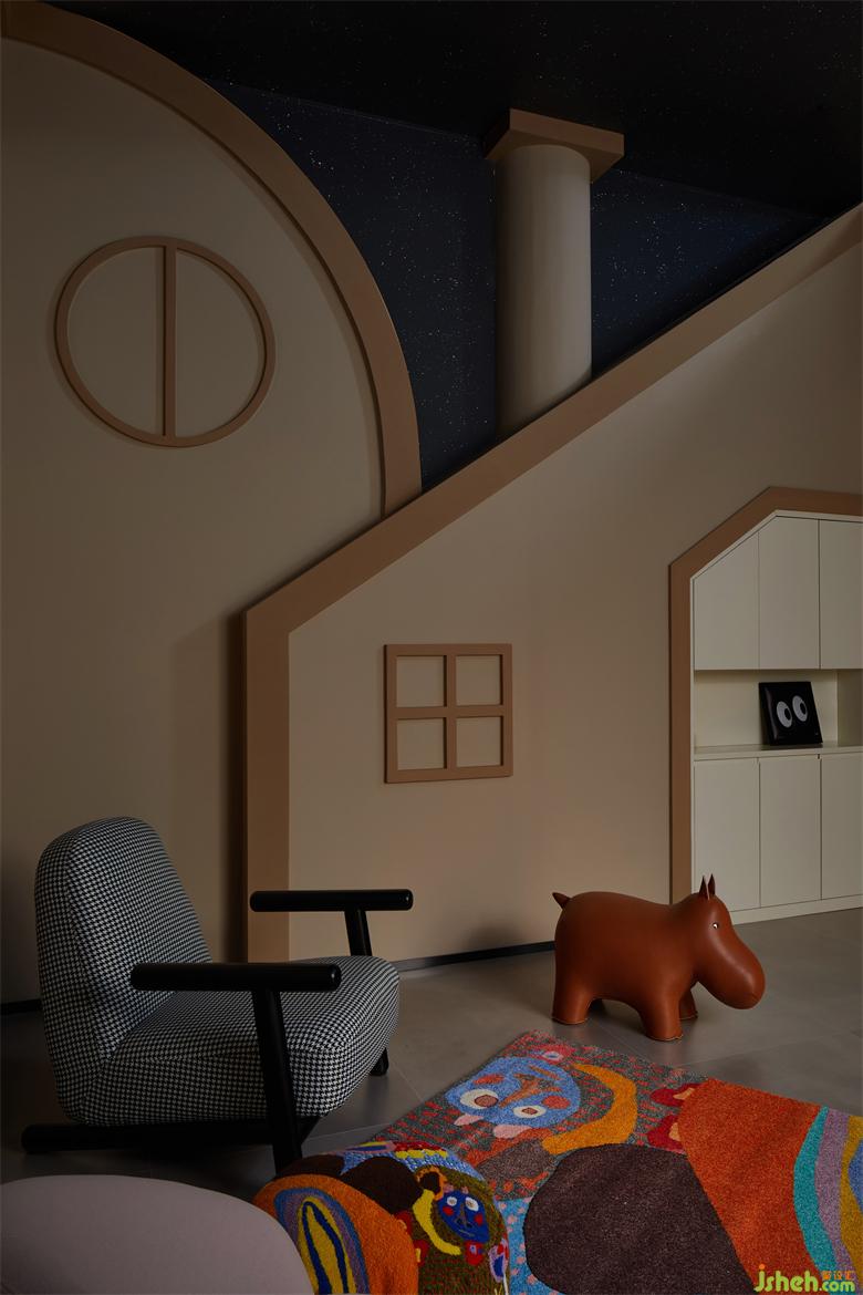負(fù)二樓不同于樓上的采光,順應(yīng)昏暗的空間,我們?yōu)樾∨笥汛蛟炝艘粋€(gè)趣味盎然的“夜空小鎮(zhèn)”娛樂(lè)空間,在天花繁星點(diǎn)點(diǎn)的襯托下與父母嬉戲,其樂(lè)融融。花園疊墅設(shè)計(jì)讓每位家庭成員都有自己舒適的區(qū)域,造型去繁化簡(jiǎn),與其它空間取得恰到好處的平衡。