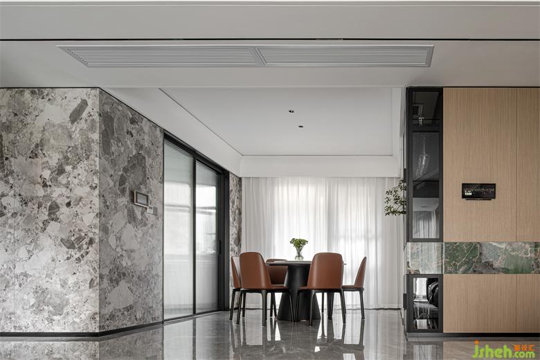 兩側(cè)的巖板隔著餐廳相互呼應(yīng),中間有純凈的陽(yáng)光流轉(zhuǎn)自如,在寬敞的用餐空間里訴說(shuō)著生活的美好與寧?kù)o。室內(nèi)設(shè)計(jì)師優(yōu)雅與光影融為一體,色彩與結(jié)構(gòu)暗地交融。在時(shí)光的流逝中沉淀著生活的溫度。