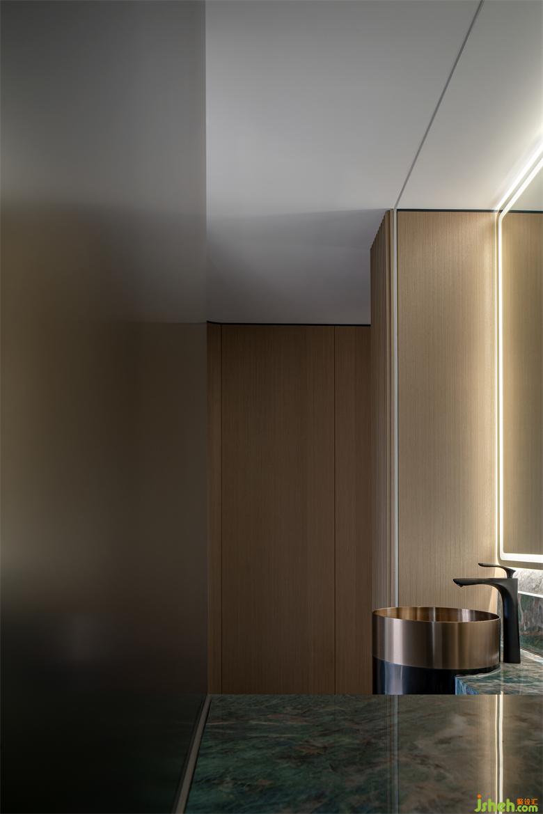 臺(tái)盆與其他功能的區(qū)域隔離,充分考慮了不同生活場(chǎng)景下的便利與實(shí)用。既保證了洗漱臺(tái)的潔凈干爽,室內(nèi)設(shè)計(jì)師也使它獨(dú)立存在而不影響餐廳與客廳的使用。