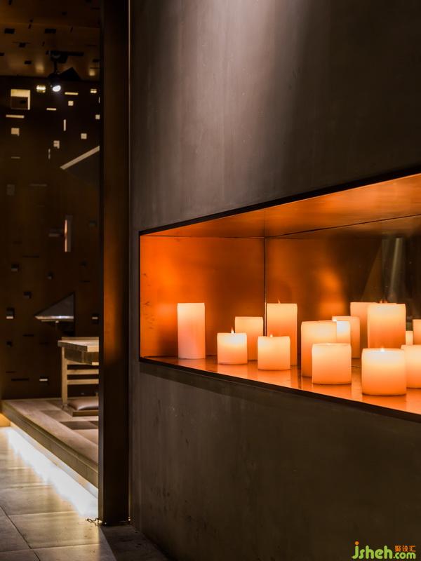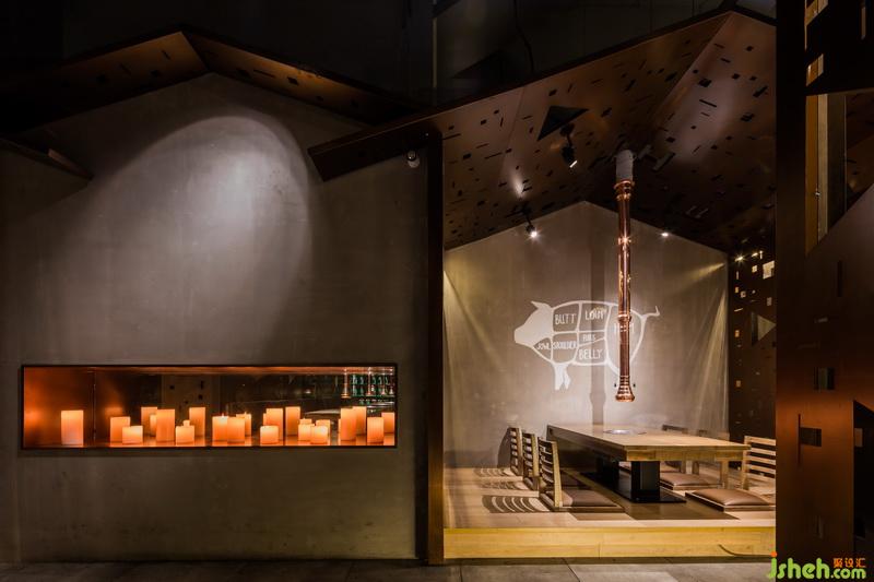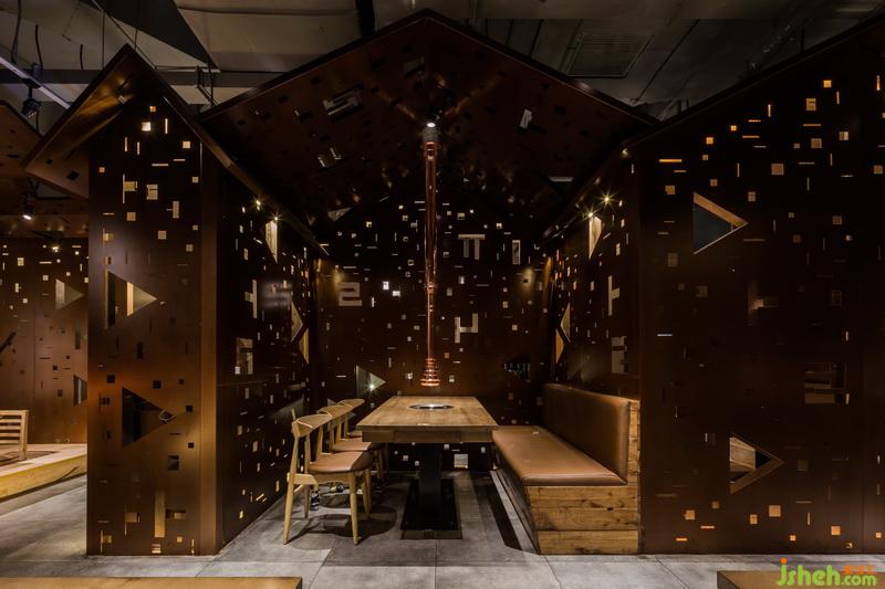 在這里,銹板和銹紅代表傳統(tǒng),水泥和灰色代表現(xiàn)代。這是時間的交疊。與烤肉不可分割的燒酒文化,以一道綠意晶瑩的酒墻出鏡。這就是文化的暗喻。