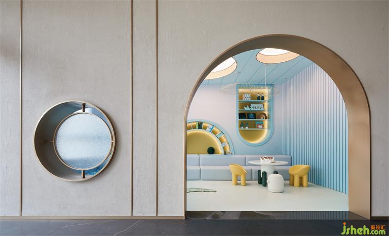室內(nèi)設(shè)計整個兒童區(qū)墻面大面積漸變藍色,打造出空靈、浪漫且具有童趣的空間氛圍,猶如蔚藍的天空之境。而在淺色調(diào)中融入淡淡的關(guān)懷,圓弧線條柔和的明黃色小凳和米白色桌子展現(xiàn)出家具的安全性和活潑性,有一種安適、自然、輕快的感覺。