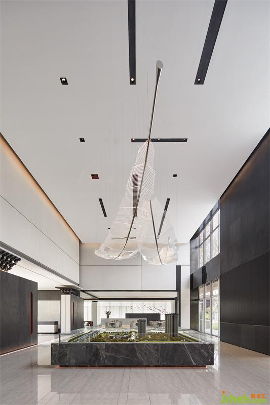 白與黑,紙與墨,售樓處設(shè)計在抽象和具象之間找到了一個平衡的點,給人“看花非花,看花是花”的韻律與感受。