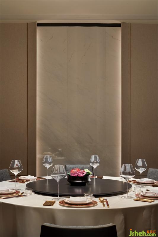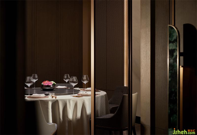 隱秘的美感得益于燈光的設(shè)計(jì),突出重點(diǎn)照明的方式,就餐區(qū)最亮,休息區(qū)次之,其他區(qū)域依次遞減來(lái)豐富空間層次,增加空間深度,且穿插部分線性洗墻的方式營(yíng)造氛圍,提升空間延展性。入夜燈亮,空間被朦朧溫柔的光所籠罩,就餐的輕盈感和氛圍感呼之欲出。