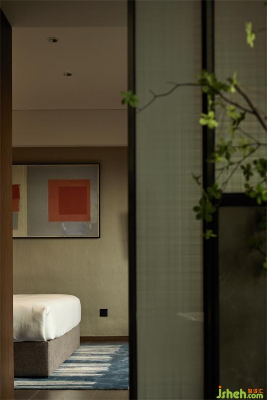 32平米房型橫臥于河岸,三亞小酒店設(shè)計把休息區(qū)和衛(wèi)生間分別設(shè)置于入門兩側(cè)。