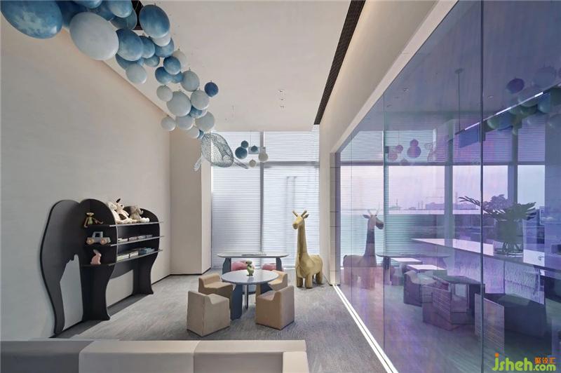 兒童區(qū)的角落藝術(shù)裝置是孩子夢(mèng)中的鯨魚和絢爛的水珠,在多彩的世界中,形塑童話般的意境。