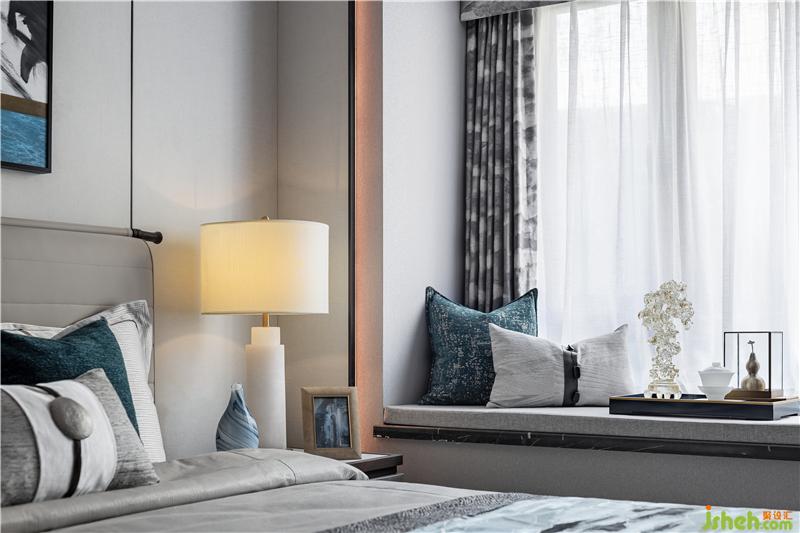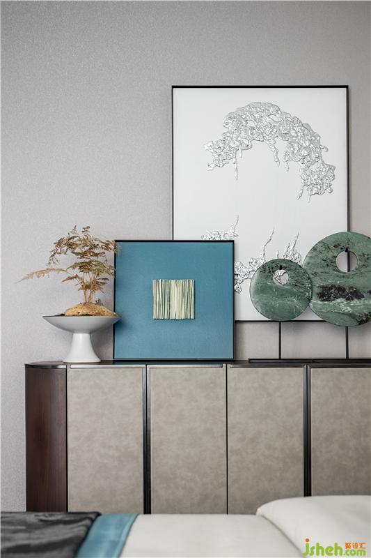 臥室清雅透亮,將寫(xiě)意之美淡淡暈染開(kāi)來(lái),松風(fēng)雅月,和田玉雕,淺灰色的硬包,再加以金屬點(diǎn)綴,奢而不過(guò),美感天成。
