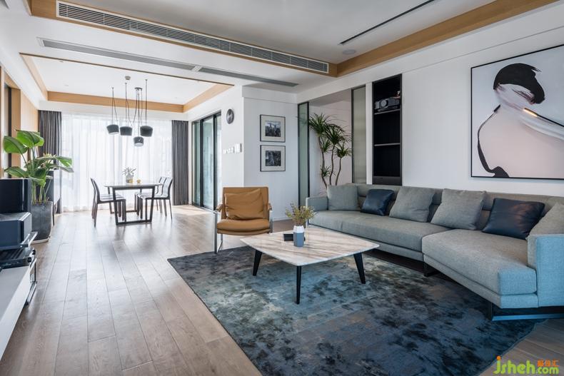 玄關(guān)處黑框玻璃的設(shè)置使客廳在視覺上有了延長和開闊的效果,原木色系的KD飾面板也在無形中劃分了餐廳與客廳的區(qū)域,層次遞進。