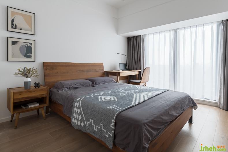 一般情況下,壁畫的懸掛位置于床頭正中間對應(yīng)的墻壁上。但設(shè)計(jì)師為了使空間達(dá)到視覺上的均衡,結(jié)合了書桌與倒凸窗的距離,在床頭柜的上方懸掛了兩幅精心挑選的小壁畫持恒。壁畫框采用黑色包邊在突顯質(zhì)感的同時(shí)對空間的整體效果上也起到了沉淀的作用。