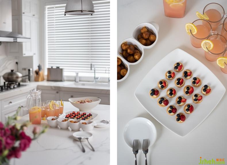 島臺(tái)大理石臺(tái)面與白色櫥柜交相呼應(yīng),這使廚房跟島臺(tái)不僅從視覺(jué)上是一個(gè)整體,也加強(qiáng)了二者的聯(lián)系。廚房在國(guó)外經(jīng)常是一家人交流最直接的地方,大人做飯,小孩寫作業(yè),島臺(tái)/餐桌對(duì)不同階段的人有著不同的功能,但有一個(gè)共同點(diǎn),便是拉近了一家人的交流。