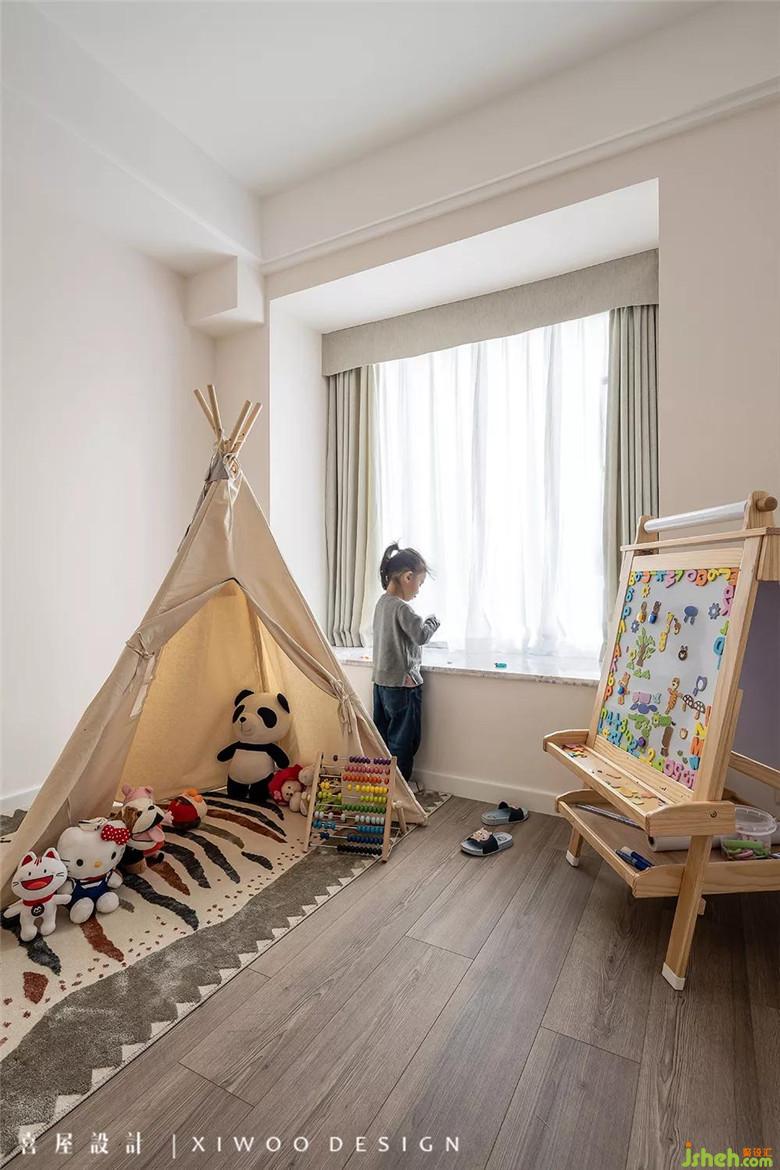 兒童房搭配淺雅而溫和的奶油粉,恰如健康肌膚的自然底色。頂面邊沿處的疊級線條躍然其上,好似用心勾勒的眉眼細(xì)節(jié),使空間呈現(xiàn)出清透怡然的裸妝效果。