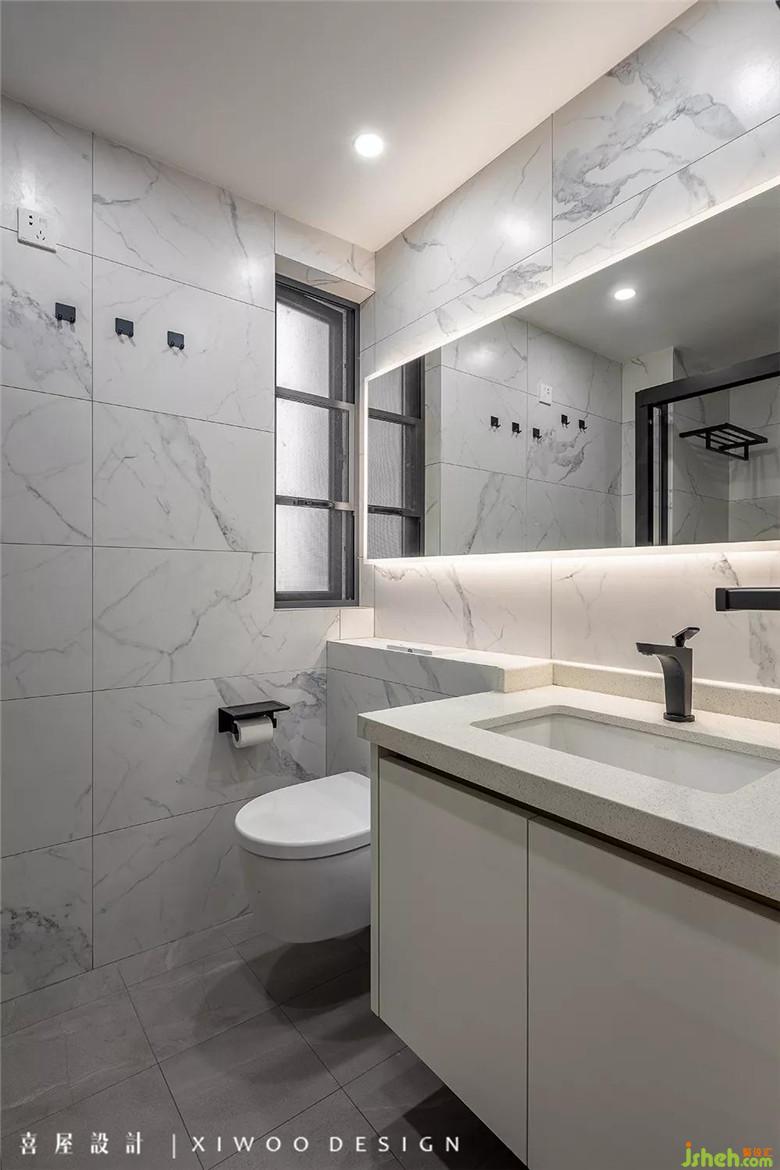 衛(wèi)生間瓷磚的選擇上主要以干凈防滑入手,壁掛式馬桶和浴室柜的排列無縫銜接組合,做到衛(wèi)生無死角。