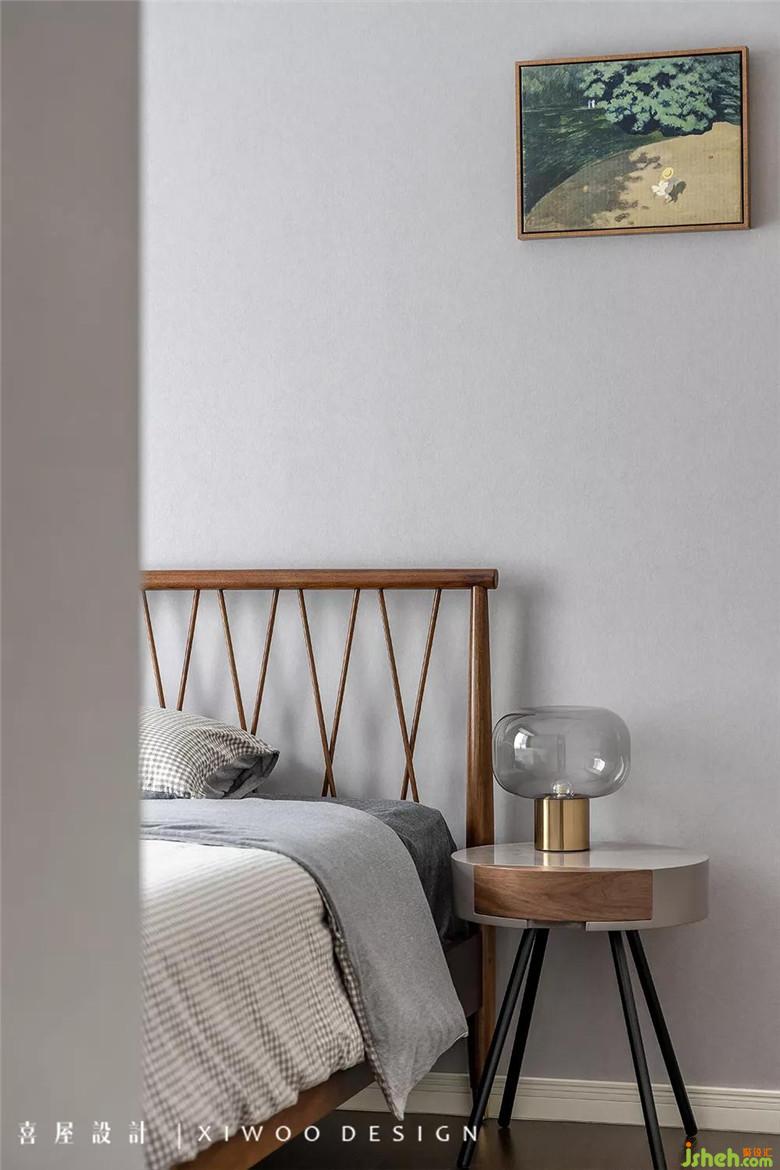 煙灰色的墻紙貫穿至主臥,搭配巧妙的木地板上墻設(shè)計(jì),渾然一體。