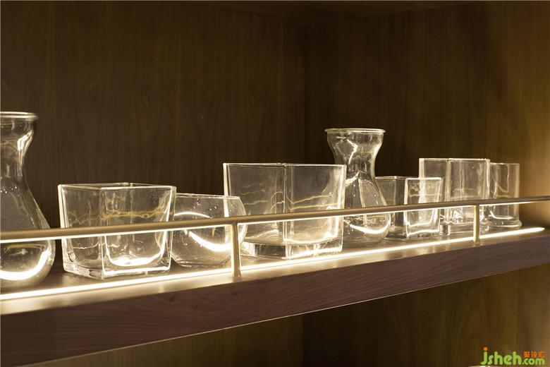 室內(nèi)設(shè)計師結(jié)合眼鏡的功能屬性抽離出幾種展示手法,固定墻面的黑鐵展架更好的襯托出眼鏡的主體地位,傳遞出陣列的美感。深色天然大理石和玻璃得組合更是暈染出一種精致優(yōu)雅的調(diào)性,金屬小車的造型不僅是對體塊的呼應(yīng),更給人帶來一種街頭售賣的感覺。