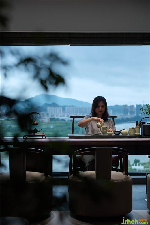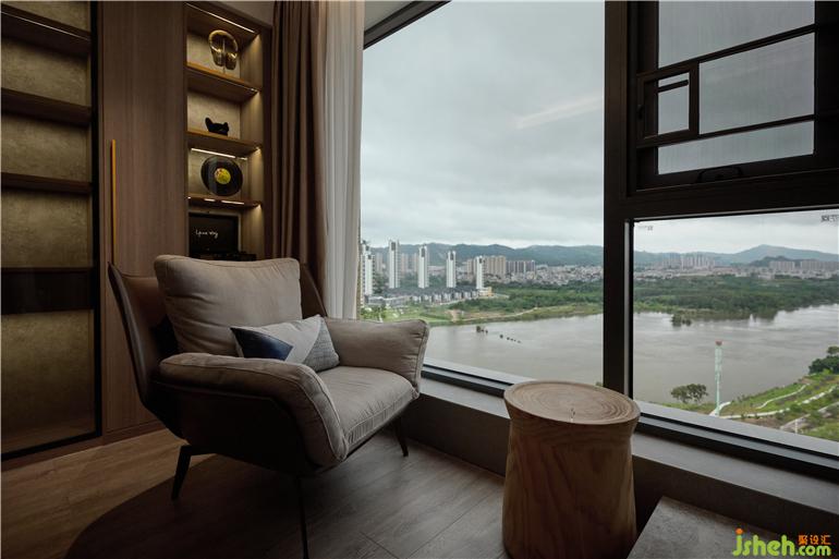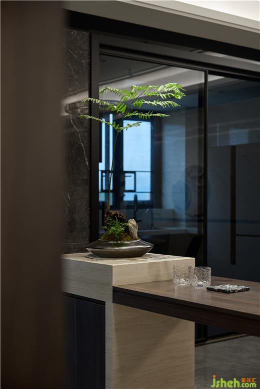 客廳與書房的綠植區(qū)采用了鋼化玻璃斜拼隔斷,使南北空氣形成對(duì)流讓植物植物更好的生長。裝修設(shè)計(jì)品茗區(qū)地面采用柔和磨砂磚,植物區(qū)采用了深色的毛石上墻,為這個(gè)小小的綠植區(qū)增添了出色的背景。