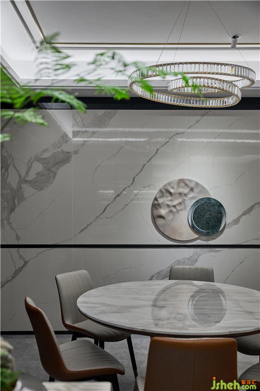 公區(qū)圍繞著整個(gè)空間布局了三個(gè)綠植區(qū),滿足主人對(duì)種植綠植的熱愛,裝修設(shè)計(jì)整個(gè)公區(qū)的墻面都是大理石加巖板的造型,獨(dú)一無二定制的黑色及銅色磨砂鈦金作為收口,更加承托出空間的高級(jí)感。